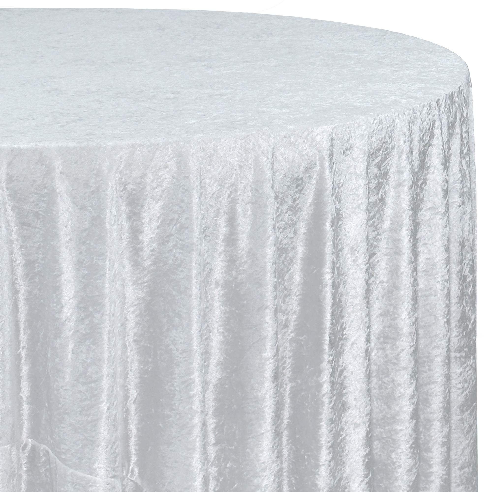 Revamp your event décor with the stunning beauty of our crushed velvet 120-inch round tablecloths – white. The velvety texture and dazzling color combination provide a euphoric and romantic event setting. We continually strive for offer high-quality rental standard tablecloths and our crushed velvet, also known as panne velvet tablecloths, are no exception! Our white 120-inch round crushed velvet tablecloths are primarily designed to provide a floor-length drop on a standard 5-foot round banquet table or provide a 24-inch drop on a 6-foot round banquet table. However, these velvet tablecloths are also ideal for highboy cocktail tables. Our 120-inch round crushed velvet tablecloths can be draped over a 36-inch highboy cocktail table to provide a floor-length drop and on a 30-inch highboy cocktail table to create a 3-inch puddle on the ground.