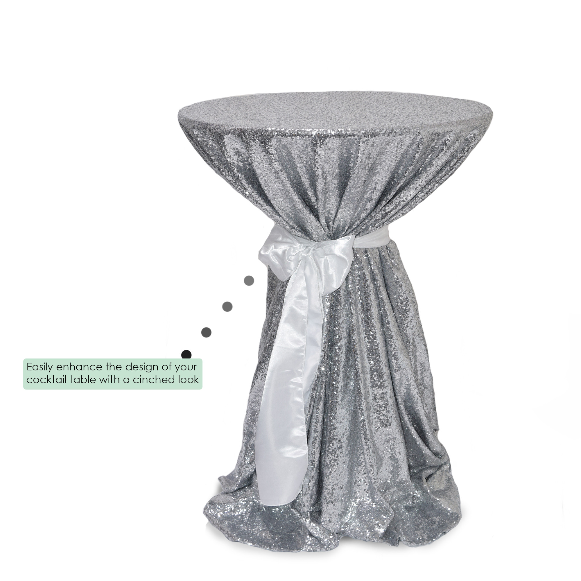 With Silver 120" Round Glitz Sequin Tablecloths from Your Chair Covers you can create a beautiful glittering table-scape to impress all your guests. These tablecloths are made rows of sequin sewn onto a taffeta material for added thickness and weight. Ideal for upscale weddings, Quinceañera parties, Hollywood Glamour inspired events, and other stylish wedding themes. Our round silver glitz sequin on taffeta tablecloths feature serged edges and are designed to provide a floor-length drop on an 5-ft round table measuring 60 in. diameter x 30 in. high or can also be used on 30 in., 32 in. or 36 in. round highboy cocktail tables.