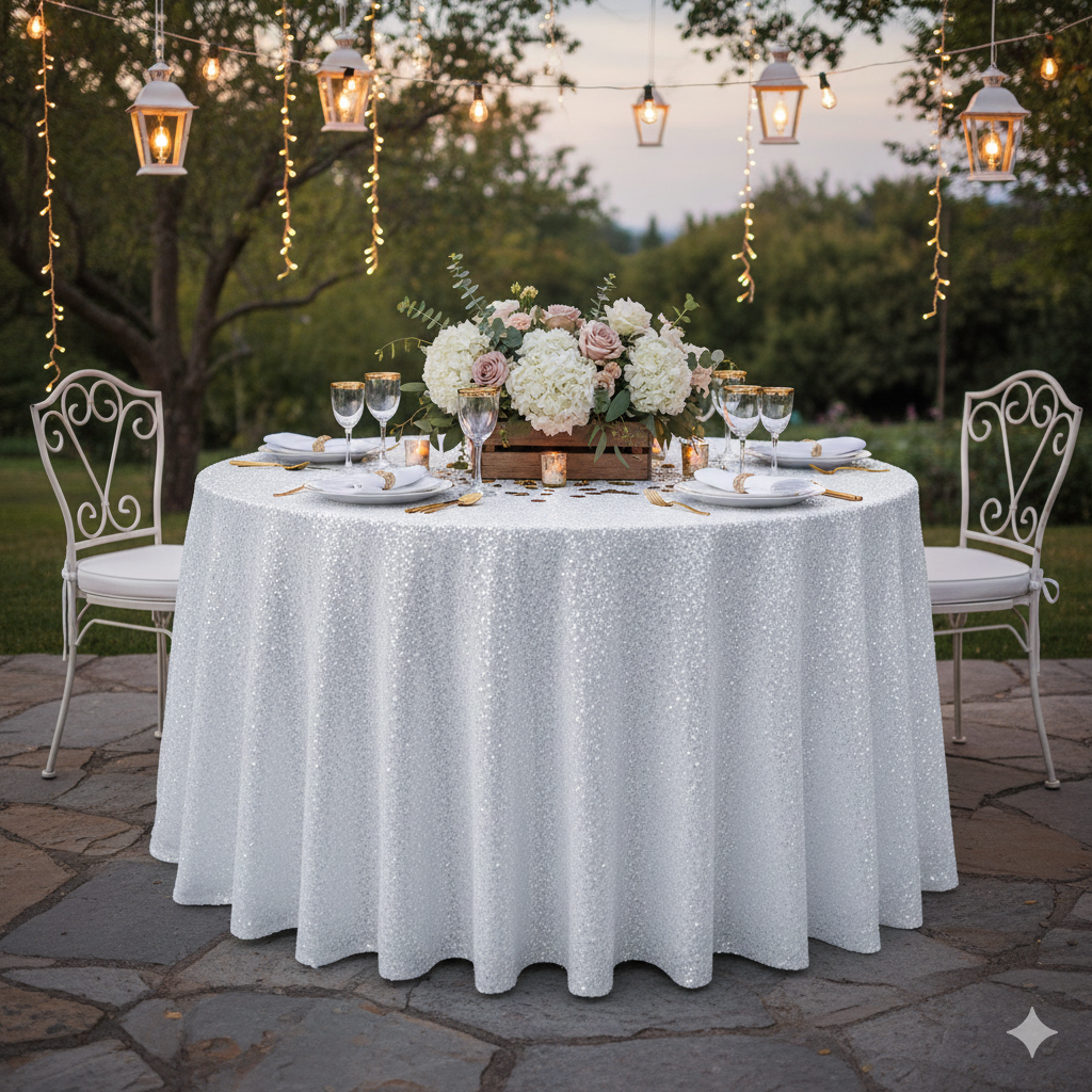 With White 120" Round Glitz Sequin Tablecloths from Your Chair Covers you can create a beautiful glittering table-scape to impress all your guests. These tablecloths are made rows of sequin sewn onto a taffeta material for added thickness and weight. Ideal for upscale weddings, Quinceañera parties, Hollywood Glamour inspired events, and other stylish wedding themes. Our round white glitz sequin on taffeta tablecloths feature serged edges and are designed to provide a floor-length drop on an 5-ft round table measuring 60 in. diameter x 30 in. high or can also be used on 30 in., 32 in. or 36 in. round highboy cocktail tables.