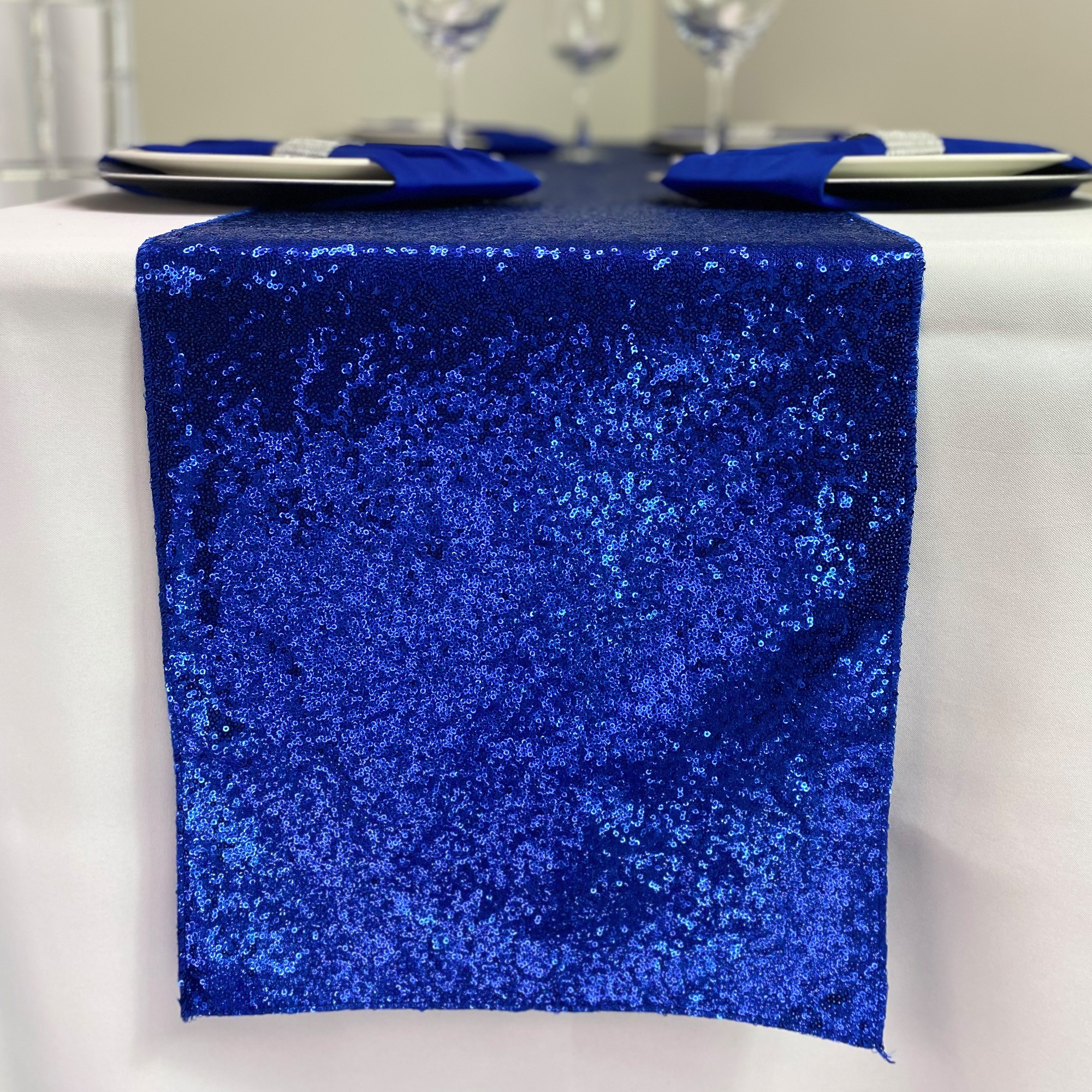 14 x 108 inch Glitz Sequin Table Runners in royal blue for weddings and special events that demand modern sophistication or ultra high-end look. Each sequin table runner features a high quality taffeta fabric. This specialty table runner is perfect for upscale weddings, Quinceañera parties, Hollywood Glamour inspired events, and other stylish wedding themes.