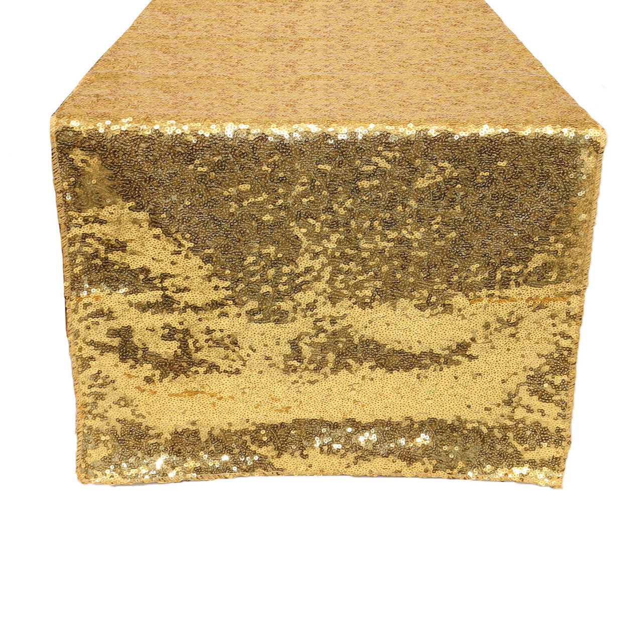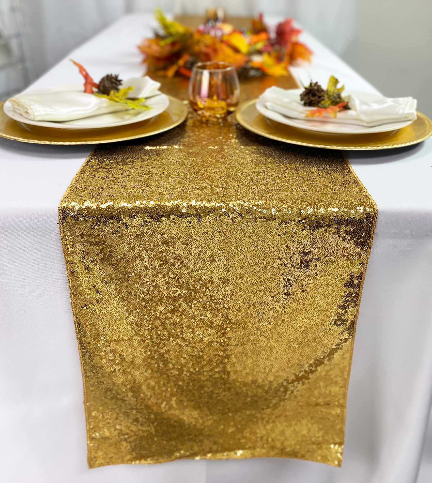 14 x 108 inch Glitz Sequin Table Runners in Gold for weddings and special events that demand modern sophistication or ultra high-end look. Each sequin table runner features a high quality taffeta fabric. This specialty table runner is perfect for upscale weddings, Quinceañera parties, Hollywood Glamour inspired events, and other stylish wedding themes.