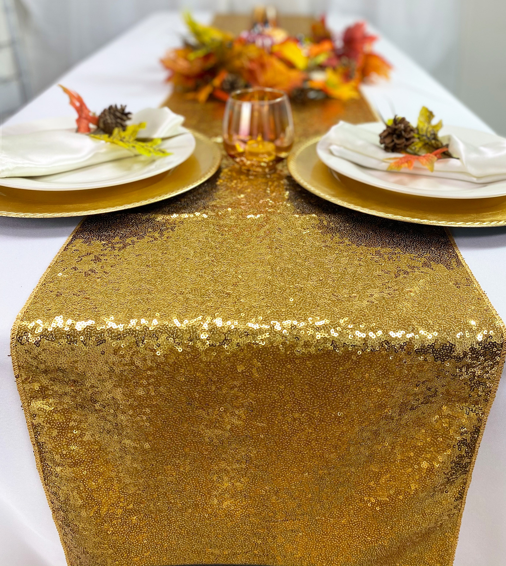 I ordered 2 of these gold sequined runners for a 1929 Gatsby-type luncheon to celebrate my mother‘s 89th birthday. The sequins are very close together and provide optimal shine and shimmer. This is a really great buy. You can’t beat the price!