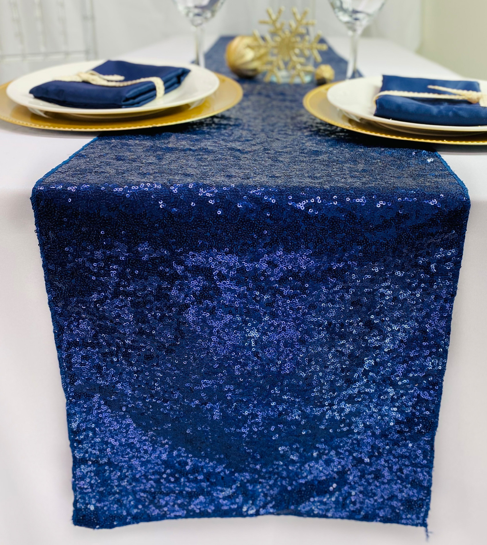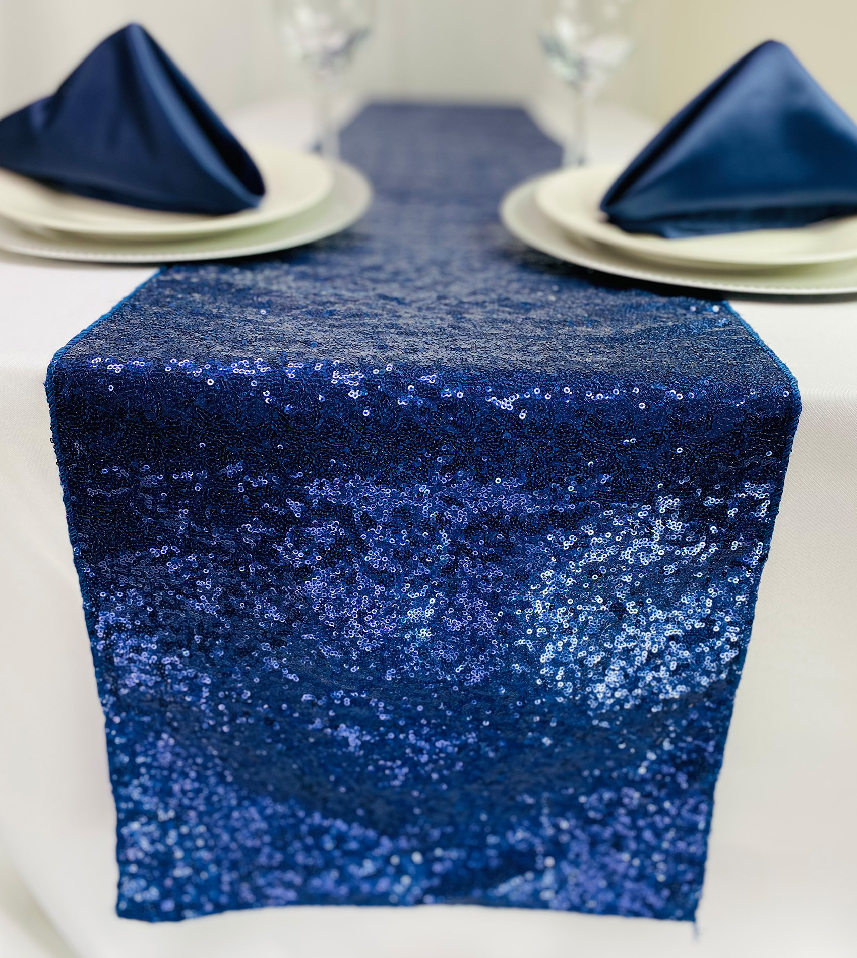 14 x 108 inch Glitz Sequin Table Runners in Navy Blue for weddings and special events that demand modern sophistication or ultra high-end look. Each sequin table runner features a high quality taffeta fabric. This specialty table runner is perfect for upscale weddings, Quinceañera parties, Hollywood Glamour inspired events, and other stylish wedding themes.