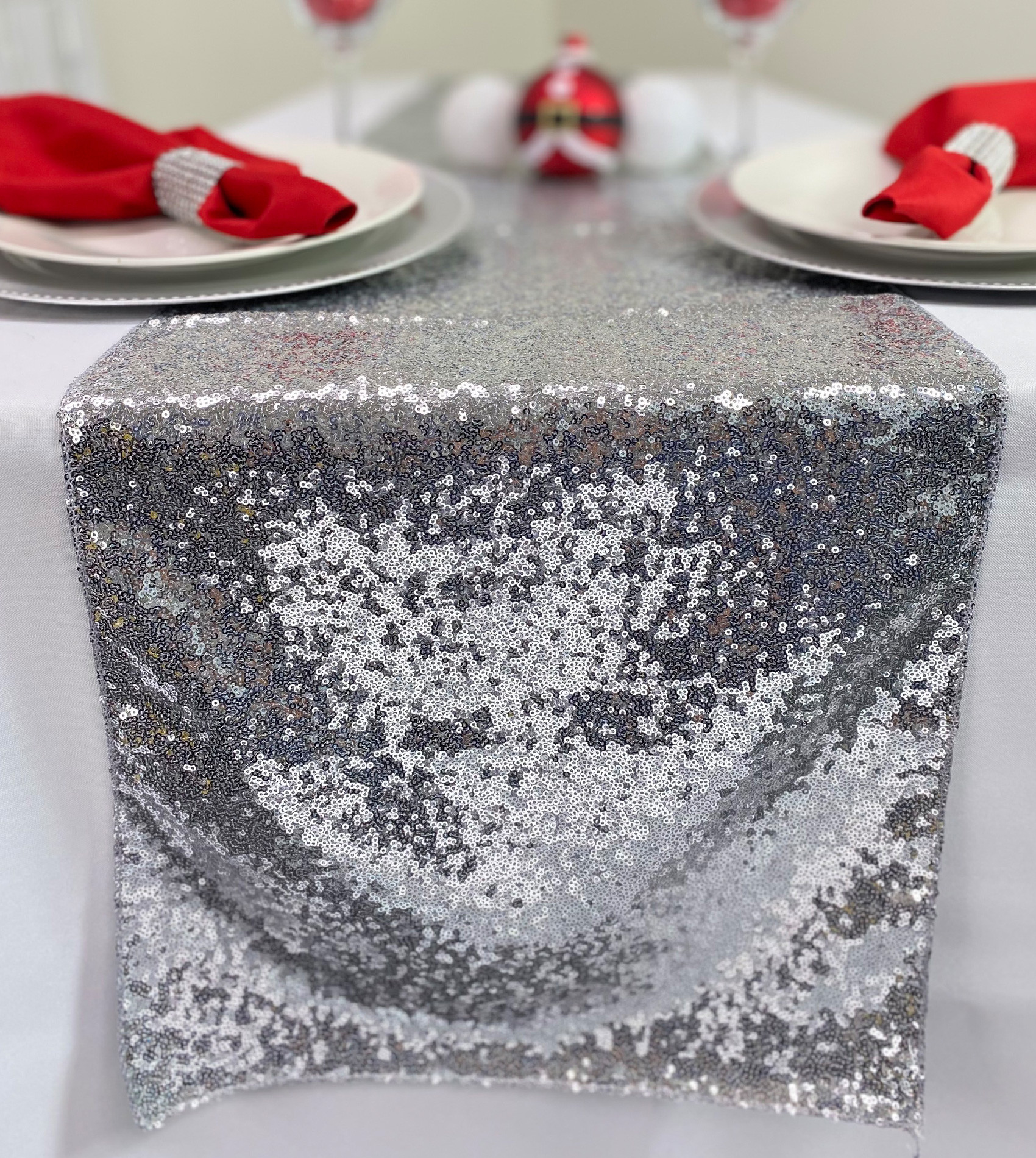 14 x 108 inch Glitz Sequin Table Runners in Silver for weddings and special events that demand modern sophistication or ultra high-end look. Each sequin table runner features a high quality taffeta fabric. This specialty table runner is perfect for upscale weddings, Quinceañera parties, Hollywood Glamour inspired events, and other stylish wedding themes.