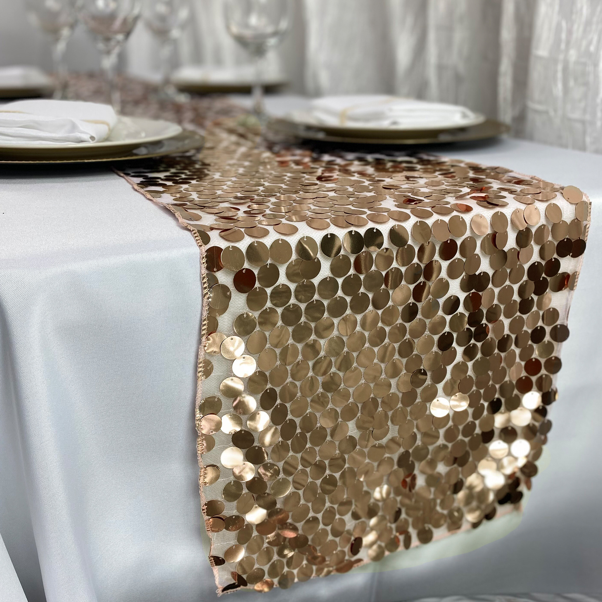 14 x 108 inch Large Payette Sequin Table Runners in Champagne for weddings and special events that demand modern sophistication or ultra high-end look. Each sequin table runner features a large "dime sized" sequin that will add texture and elegance to your decor. This specialty table runner is perfect for upscale weddings, Quinceañera parties, Hollywood Glamour inspired events, and other stylish wedding themes.