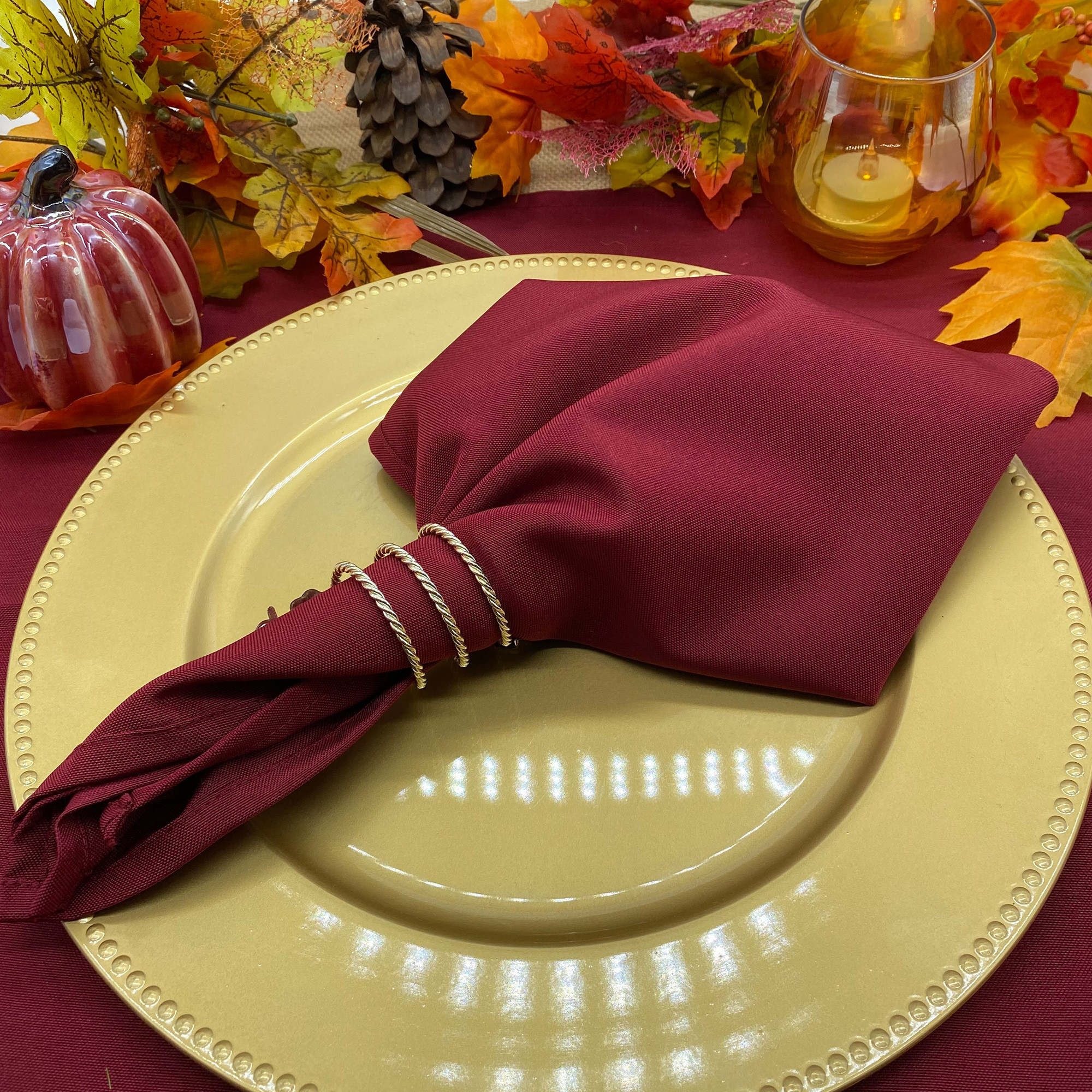 Add rich elegance to your table setting with our Burgundy Polyester Napkins. Made from premium polyester fabric, these 20" x 20" napkins feature a smooth matte finish and a finely stitched double-fold hem for a clean, refined appearance. The deep burgundy hue offers a timeless, sophisticated look that’s perfect for weddings, formal dinners, holiday gatherings, and upscale events. Reusable, wrinkle-resistant, and easy to care for, these napkins provide the perfect blend of durability and style—making them a versatile addition to any table décor.