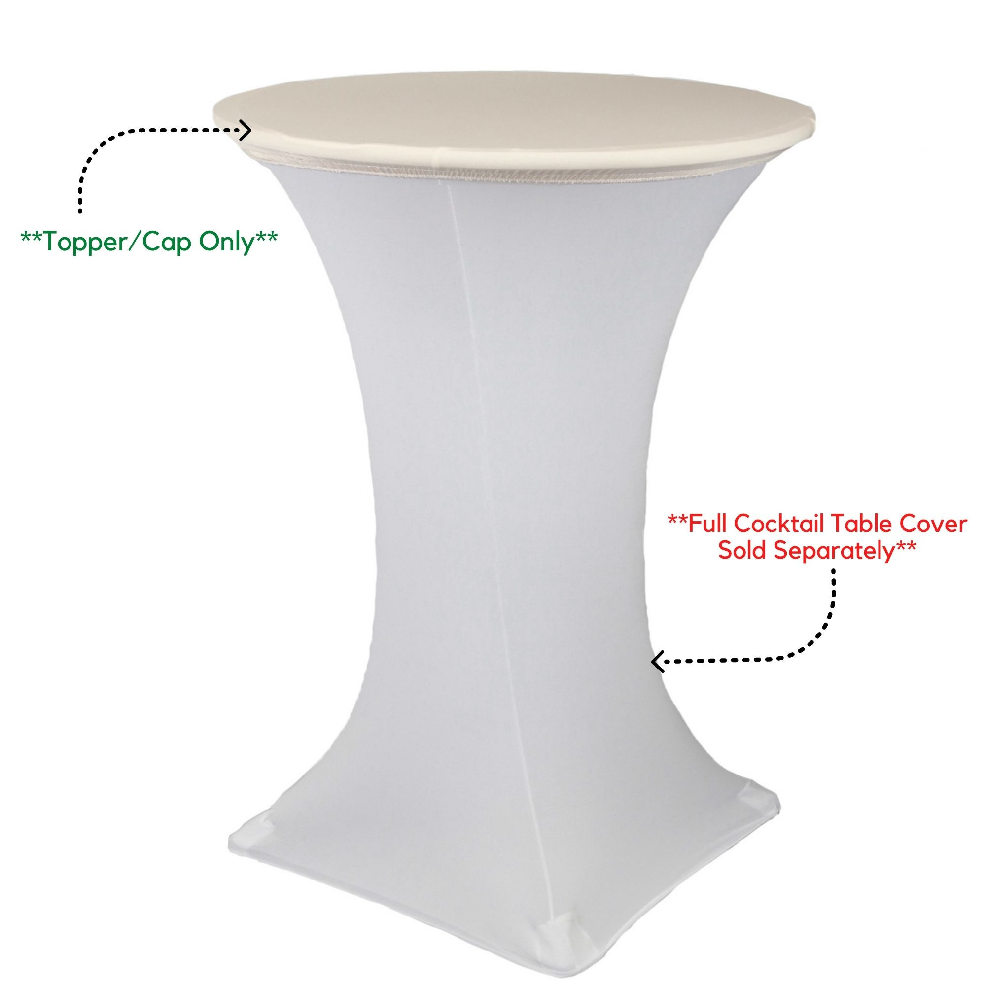 Enhance the look of your highboy or lowboy cocktail tables with our 30 inch Spandex Table Toppers in ivory. Use our high quality 30 inch stretch spandex table toppers over stretch spandex table covers (sold separately) to complete the look of your wedding and event tables! Made from high quality four-way stretch spandex material, our 30 inch stretch spandex table toppers in ivory exemplify modern sophistication and luxurious elegance. They are designed to fit 30" round highboy or lowboy tables at weddings, casinos, hotels, restaurants and other special events. Buy stretch spandex table toppers at Your Chair Covers to benefit from the discount wholesale prices that we offer.