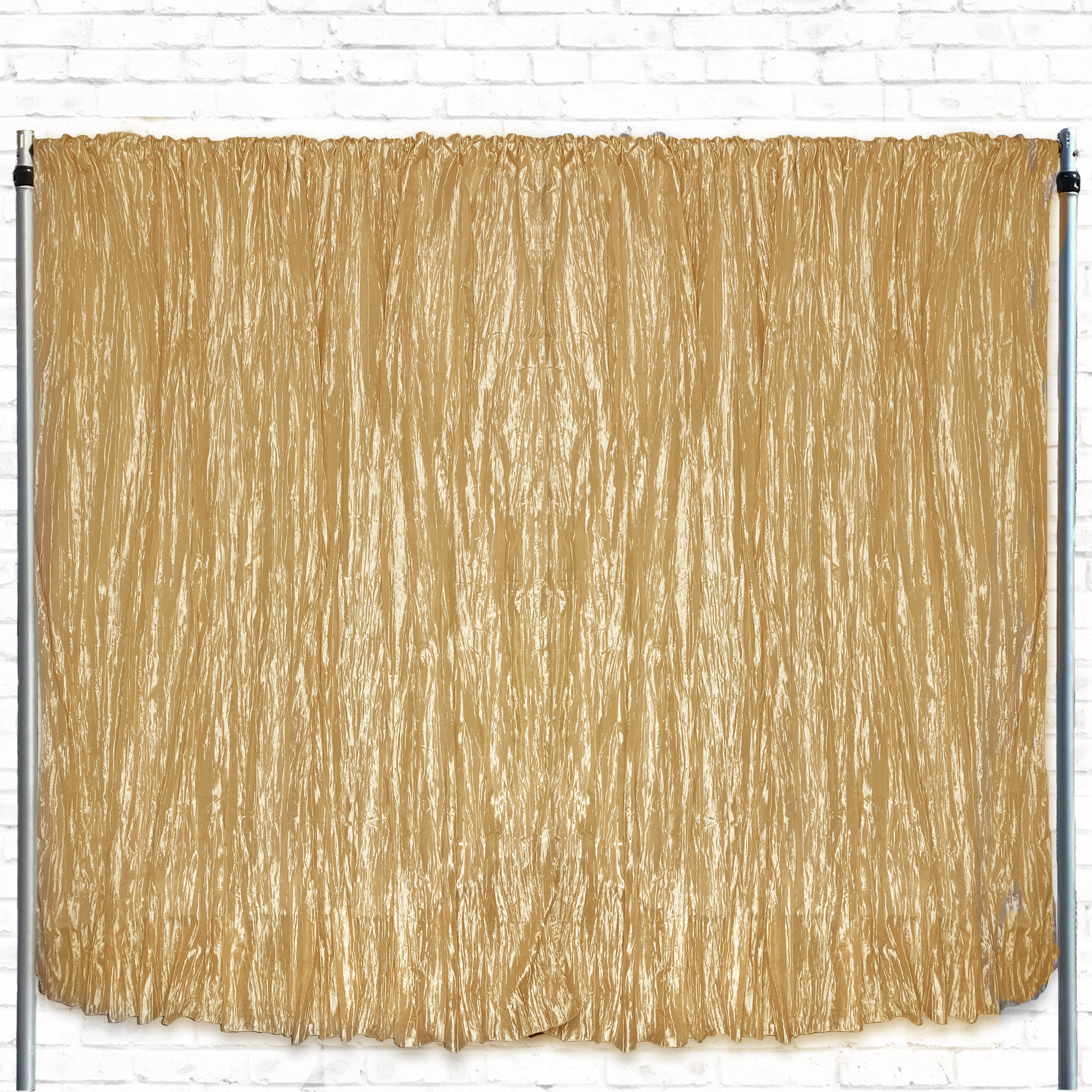 Crinkle Taffeta Drape/Backdrop 12 ft x 97 inches - Gold are made from high-quality taffeta material. These multipurpose drapes can be used to add texture, allure and supplemental beauty for weddings, trade shows, birthdays, and any event that requires the coverage of walls or ceilings. Why rent drapes if you can purchase them brand new for the cost of a rental? These premium backdrops are a great addition to an event planner’s inventory, and also, for DIY brides. These gold drapes/backdrops will exquisitely compliment your décor and create a beautiful setting for your special day.