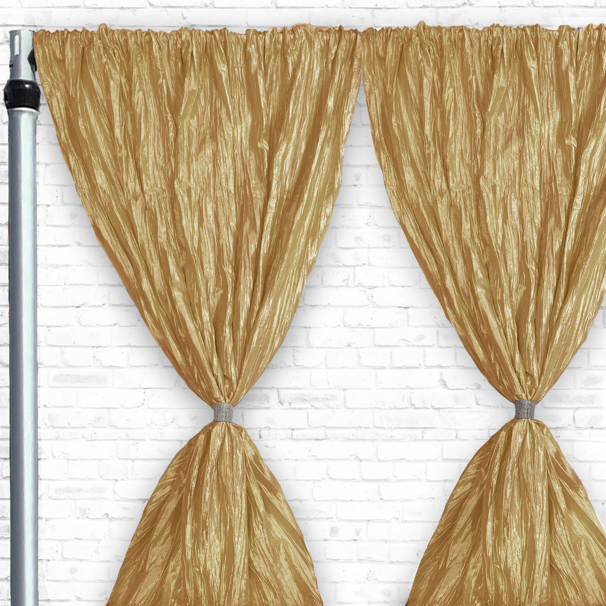 Crinkle Taffeta Drape/Backdrop 14 ft x 97 inches - Gold are made from high-quality taffeta material. These multipurpose drapes can be used to add texture, allure and supplemental beauty for weddings, trade shows, birthdays, and any event that requires the coverage of walls or ceilings. Why rent drapes if you can purchase them brand new for the cost of a rental? These premium backdrops are a great addition to an event planner’s inventory, and also, for DIY brides. These gold drapes/backdrops will exquisitely compliment your décor and create a beautiful setting for your special day.