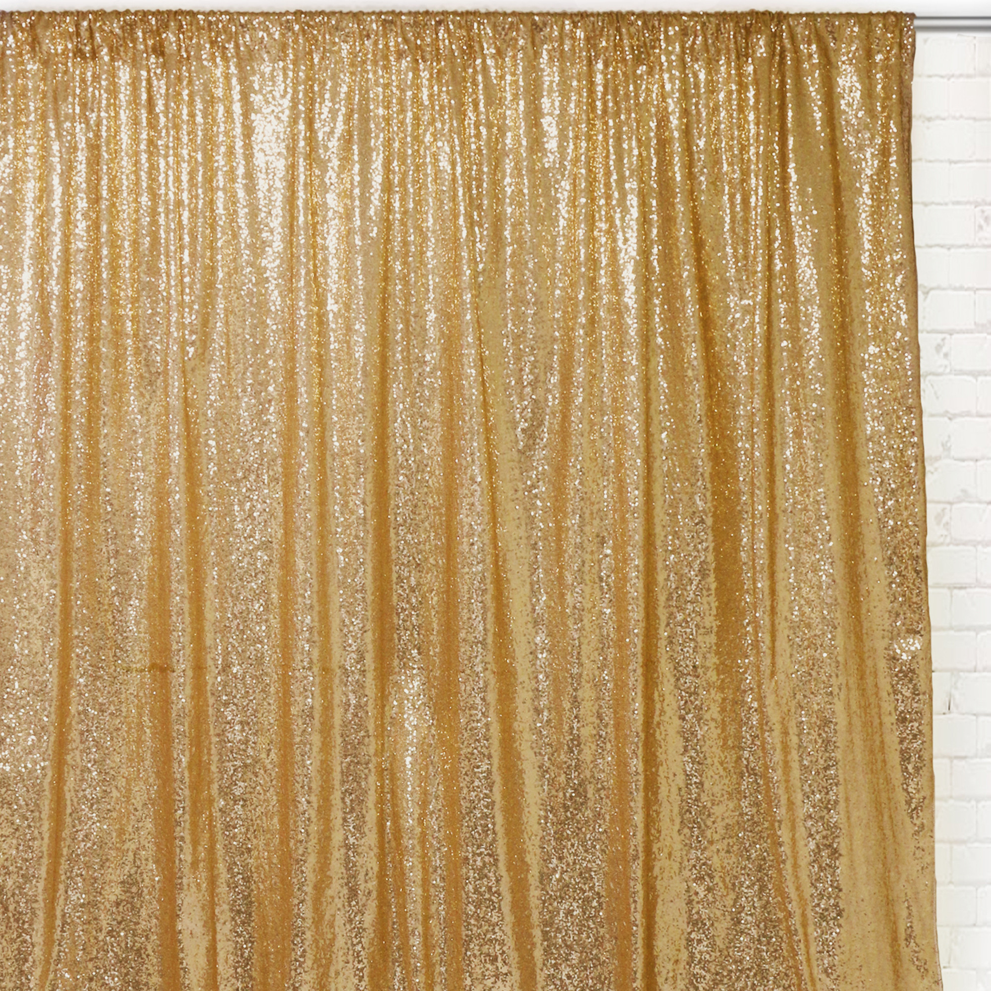 Glitz Sequin Drape/Backdrop 14 ft x 104 inches feature lustrous rows of sequins embedded on high-quality taffeta material (material is not sheer/see-through). These multipurpose drapes can be used as a glamorous photo booth backdrop, or drape to add allure and supplemental beauty for weddings, trade shows, birthdays, and any event that requires the coverage of walls or ceilings. Why rent drapes if you can purchase them brand new for the cost of a rental? These premium backdrops are a great addition to an event planner’s inventory, and also, for DIY brides. These gold drapes/backdrops will exquisitely compliment your décor and create a beautiful setting for your special day.