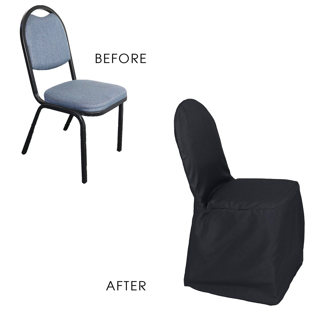 Durable and of premium quality, our polyester banquet chair cover in black is designed to fit any standard banquet chair with round top. These polyester seat covers for banquet chairs are also known for being the most economical choice, as far as value for your money is concerned. These are very affordable! For years now, we've been supplying these black chair covers to chair cover rental companies, restaurants, wedding venue owners, hotel and catering business owners. These types of chair slipcovers stylishly contour both sides of the banquet chair. Made from high quality polyester material, our black chair cover features serged edges to prevent fraying and for a professional, elegant appearance. If you're planning a lavish event, chair covers from Your Chair Covers make an excellent choice because our wholesale tablecloth and chair cover company is known for meeting hotel and restaurant product quality standards.