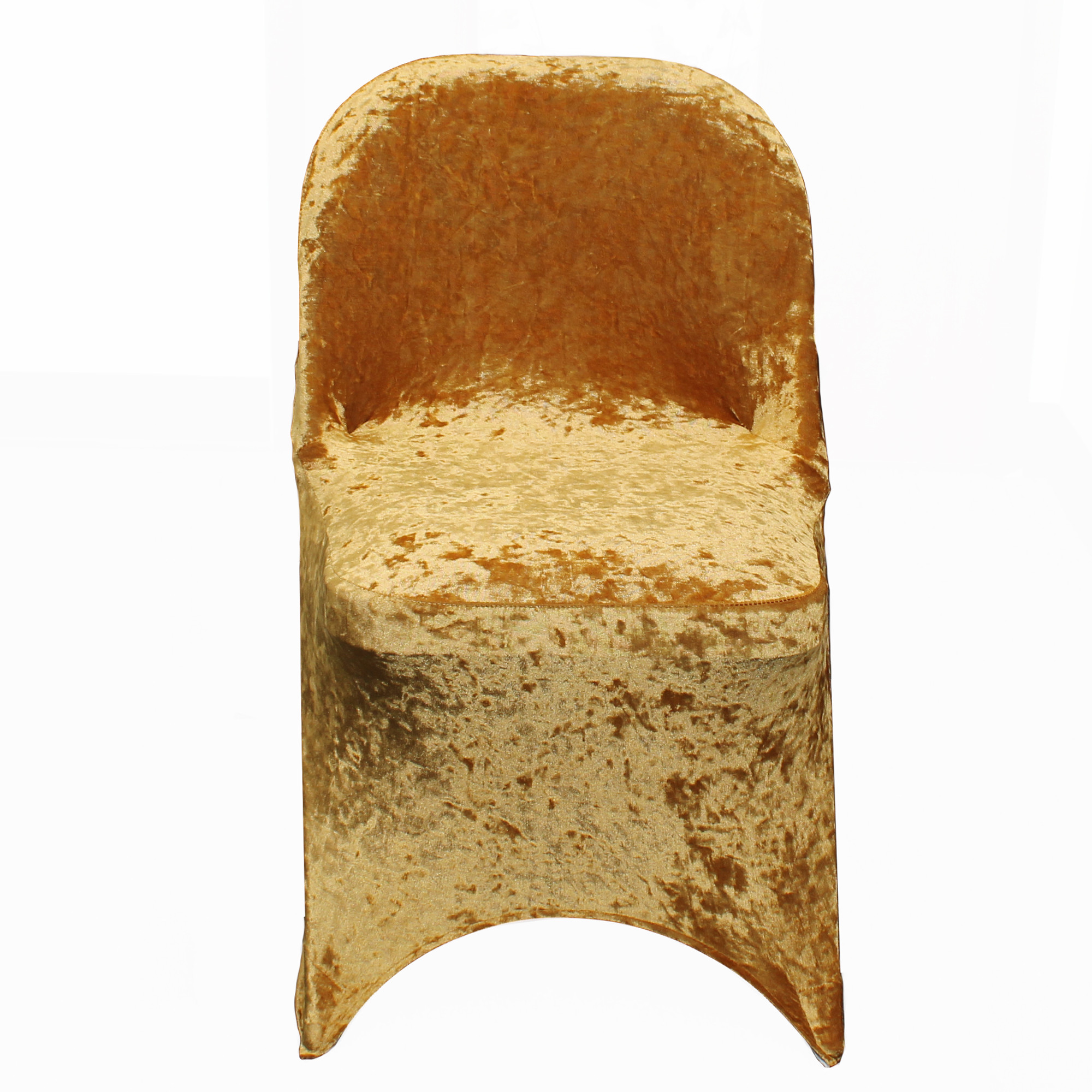 Durable and of premium quality, our velvet spandex folding chair cover in gold is designed to fit any standard folding chair. Made from high quality velvet stretch spandex material, our gold velvet stretch spandex chair covers exemplify modern sophistication and luxurious elegance. For years now, we've been supplying these gold velvet stretch chair covers to chair cover rental companies, restaurants, wedding venue owners, hotel and catering business owners. These types of chair slipcovers stylishly contour folding chairs, giving them the sleek, formal appearance. Gold spandex chair covers from Your Chair Covers have deep elastic foot pockets, do not require ironing and can be laundered countless times. If you're planning a lavish event, chair covers from Your Chair Covers make an excellent choice because our wholesale tablecloth and chair cover company is known for meeting hotel and restaurant product quality standards.